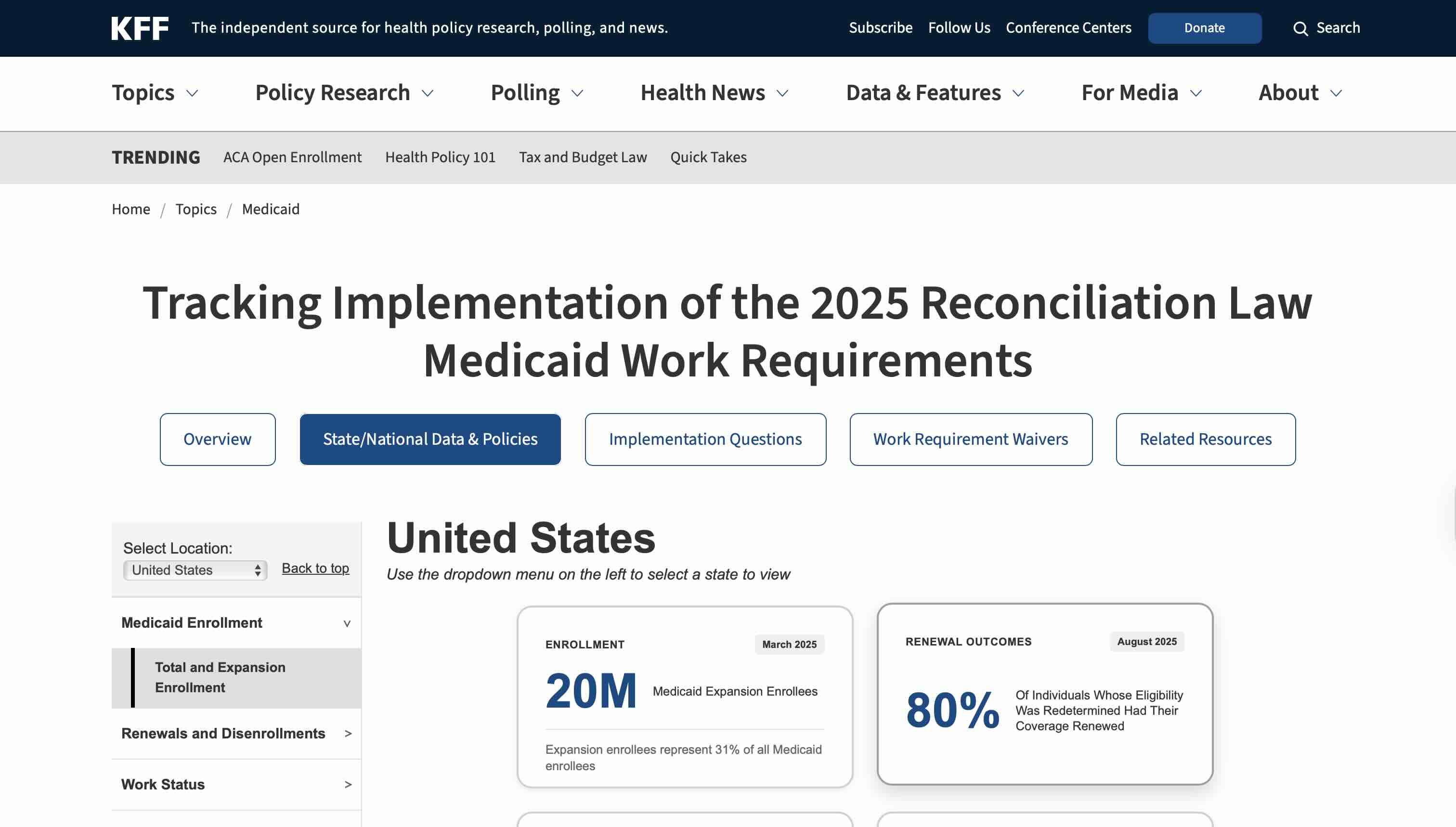 This resource provides data, analysis, and context on the implementation of new Medicaid work requirements, including enrollment trends, renewal outcomes, and state policy differences.