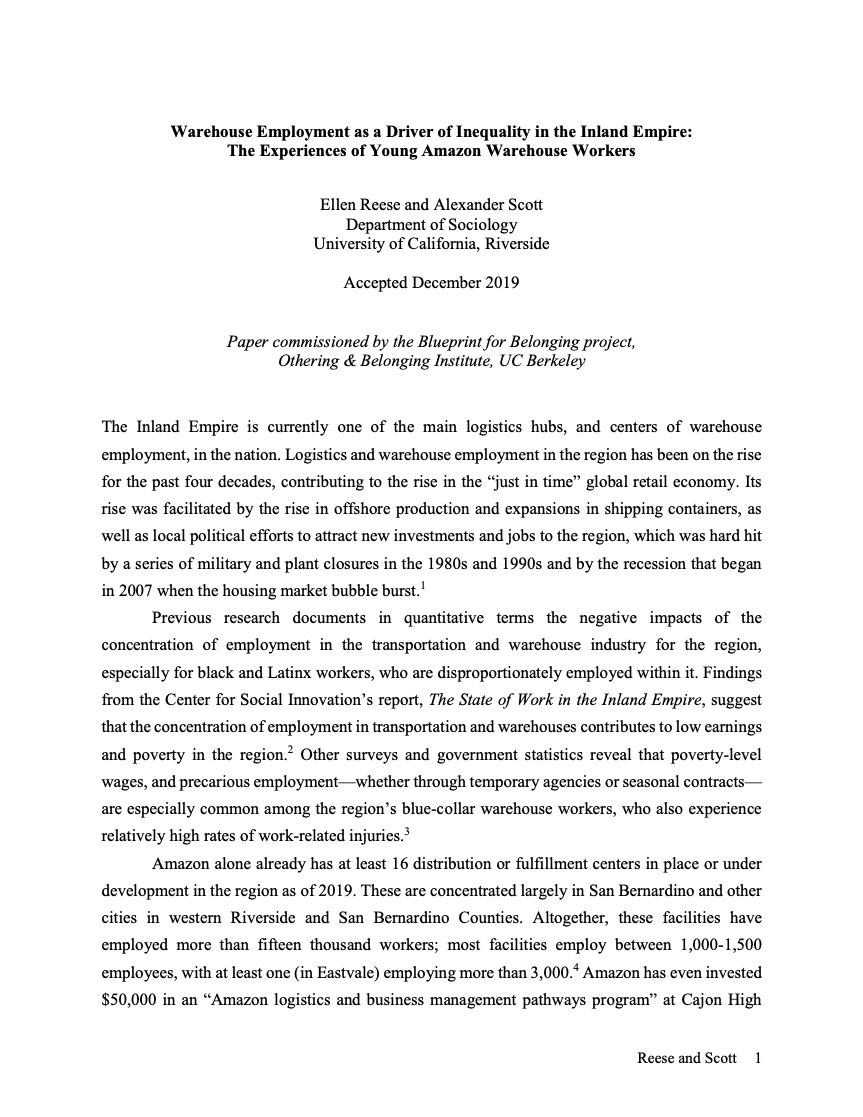 This resource explores how warehouse employment—particularly at Amazon—drives inequality among young workers in California’s Inland Empire by limiting upward mobility and impacting physical and mental health.